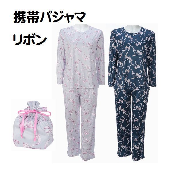 携帯パジャマ リボン柄 トラベルパジャマ ポーチ付 コンパクト パジャマ 旅行パジャマ 婦人 レディース ルームウエアー