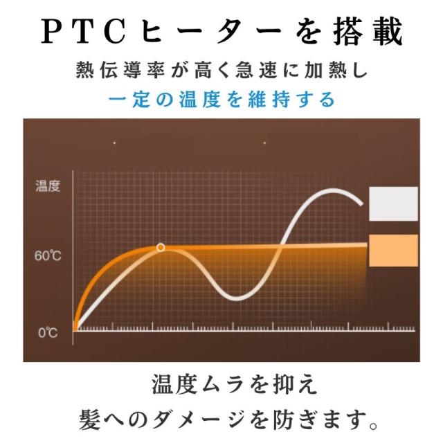 PTCヒーターを搭載し、高い熱伝導率でたった30秒で急速加熱。朝の忙しい時間でも、待ち時間を最小限に抑えてサッと使えます。一定の温度をしっかりキープするので、温度ムラがなく、髪へのダメージを抑えながら美しく仕上げます。