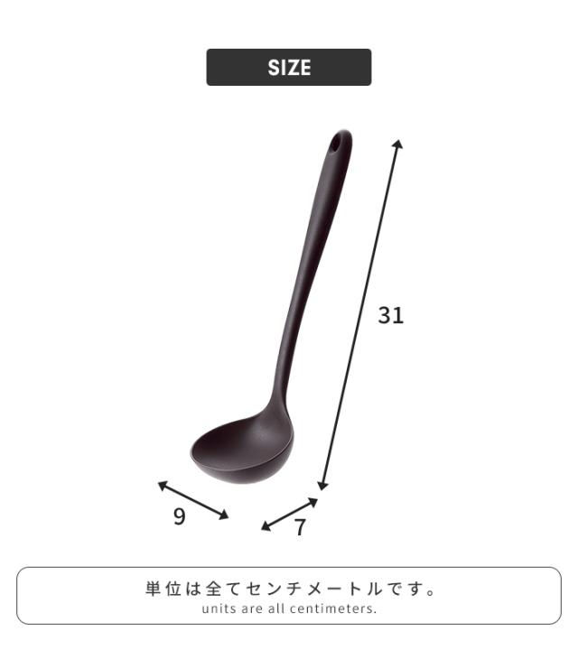 | 【kuracia】SILICONE TOOLS 落ち着きのあるダークブラウン色のシリコーンキッチンツールシリーズ。 すくいやすい形状のお玉です。 |