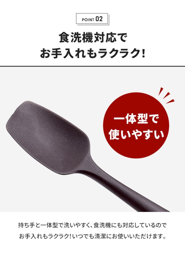 | ・柔軟性がある素材なので、コーティングが施された鍋やフライパンにも安心してご使用いただけます。 ・調理中の食材もキズつけにくく、お料理がキレイに仕上がります。 ・耐熱温度が高いので、様々な調理に使えます。 ・滑りにくく、安定して作業ができます。 ・本体と柄につなぎ目がない一体型なので、とっても洗いやすい。 |