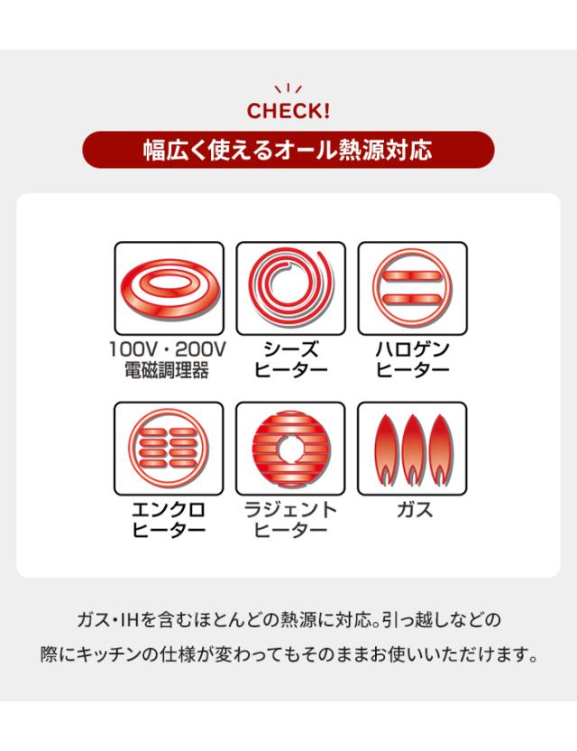 | 200V|オール熱源対応 ◎全ての熱源に対応しています。 (※電子レンジには使用できません) ・電磁調理器 ・ガスコンロ ・エンクロヒーター ・ラジェントヒーター ・ハロゲンヒーター ・シーズヒーター |