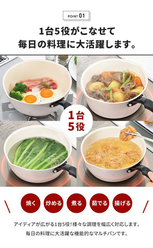 キーワード: マルチパン 22cm セラミック塗膜加工 オール熱源対応 一台5役 撥水性 調理鍋 片手鍋 深型 汚れにくい 調理器具 便利 片手鍋 なべ アルミ製 調理器具 IH対応 ガス火対応 マルチに使える 煮る 茹でる 揚げる 焼く 炒める 撥水性 消耗しにくい 安心 安全 白色 可愛い キッチン 台所