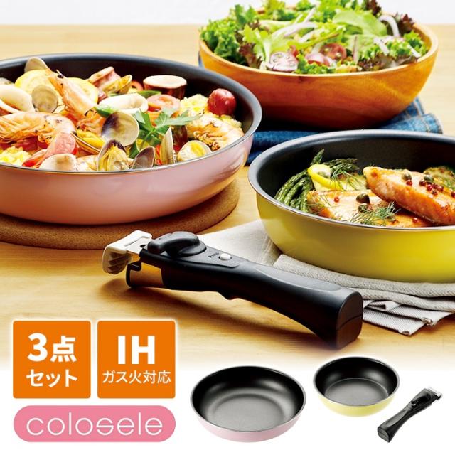 | 【colosele|コロセレ】 ハンドルを外して、料理をそのまま食卓へ。 ベーシックなアイテムをチョイスした便利な3点セット。 色とサイズを選んで使える、ハンドルの外せるフライパンセットです。 フライパンはガス火やIH調理器はもちろん、オーブンにも使用できるので(200℃以下での使用を推奨)、料理の幅が広がります。(※電子レンジでは使用できません) 重ねてコンパクトにしまえるので、収納時も省スペース。 シリーズで揃えれば、鮮やかな5種類のカラーリングでキッチンや食卓を華やかに演出します。 |