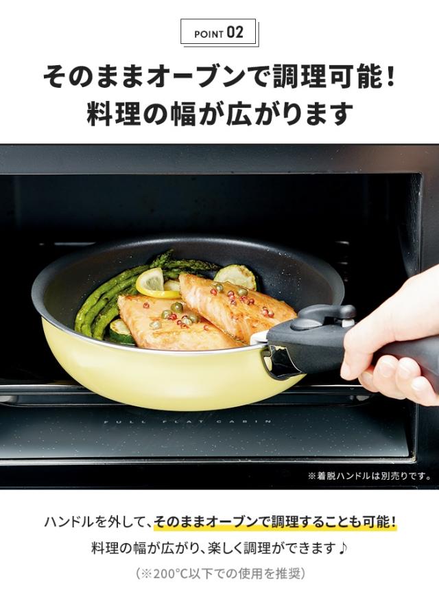 | ・ハンドル(別売り)が外せるので、調理した料理をそのまま食卓へ。 ・全ての熱源に対応しています。(※電子レンジには使用できません) ・そのままオーブンで調理可能。(200℃以下での使用を推奨) ・内面ふっ素樹脂塗膜加工なのでお手入れも簡単です。 |