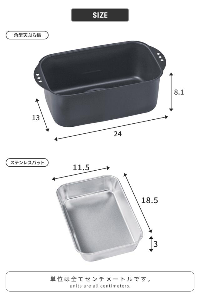 キーワード: 角型天ぷら鍋 バット3枚付き 4点セット ガス火 IH オール熱源対応 揚げ物鍋 角型 ステンレスバット キッチンツール 便利 ミニミニ天ぷら鍋 てんぷら鍋 鉄鍋 角型ミニサイズ セット品 日本製 オール熱源 調理器具 コンパクト 省スペース 調理 料理 お弁当作り 揚げ物 天ぷら キッチン 台所