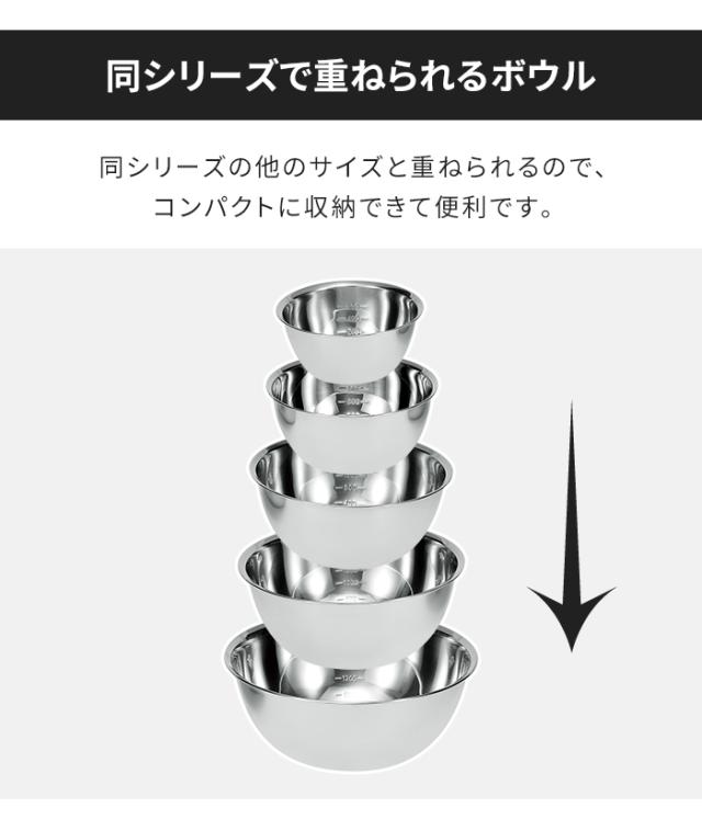 | STAINLESS STEEL PRODUCTS|chef's bowl 扱いが楽で傷つきにくい丈夫な材質のステンレス製品。 中の材料がこぼれにくく、まぜやすい深型タイプのボウル。 同サイズのパンチングボウルと重ねられるので収納にも便利。 便利な目盛り付き。 |