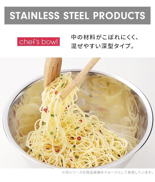 | STAINLESS STEEL PRODUCTS|chef's bowl 扱いが楽で傷つきにくい丈夫な材質のステンレス製品。 中の材料がこぼれにくく、まぜやすい深型タイプのボウル。 同サイズのパンチングボウルと重ねられるので収納にも便利。 便利な目盛り付き。 |