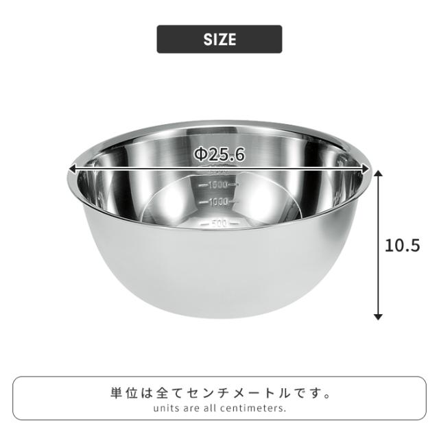 | ・傷つきにくい丈夫な材質のステンレス製 ・まぜやすい深型タイプ ・同サイズのパンチングボウルと重ねて収納できる ・目盛付き(目盛表示:500ml・1000ml・1500ml・2000ml・2500ml) |