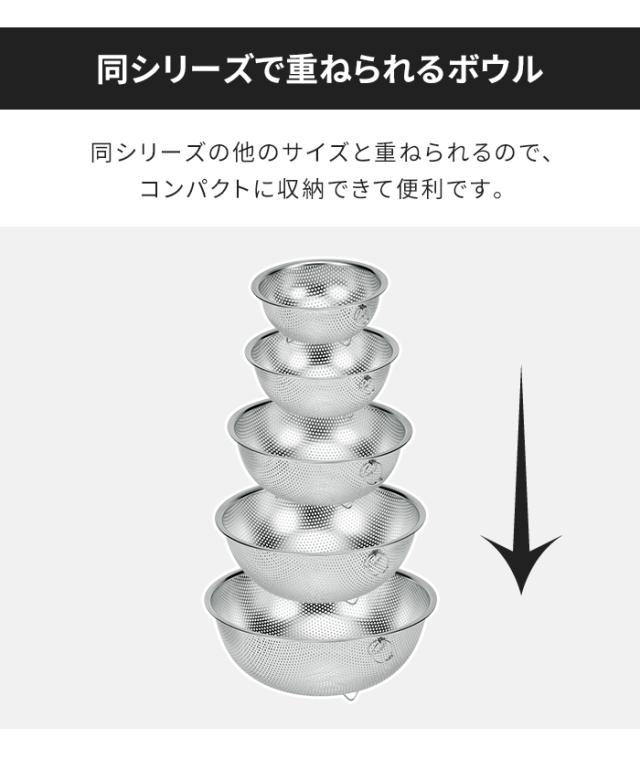 | ・傷つきにくい丈夫な材質のステンレス製 ・同サイズのボウルと重ねて収納できる |