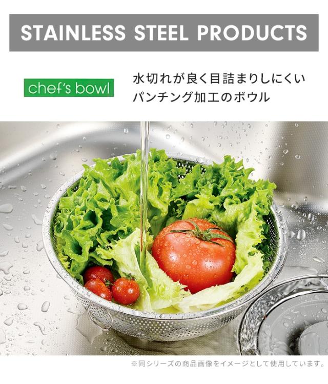 | STAINLESS STEEL PRODUCTS|chef's bowl 扱いが楽で傷つきにくい丈夫な材質のステンレス製品。 同サイズのボウルと重ねられるので収納にも便利。 |
