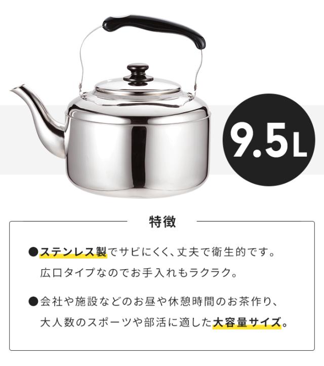 やかん ih対応 ステンレス製 ケトル 9.5L 大容量 ガス火 IH オール熱源対応 広口タイプ 衛生的 錆びにくい お茶作り 大きめ 調理器具 新生活 一人暮らし