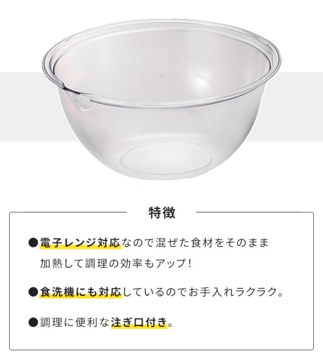 | CLEARBOWL|クリアボール 軽くて扱いやすい樹脂製。 サイズも豊富なので、あらゆる用途に使えて便利。 中身が見やすい抜群の透明感!食材の下ごしらえ・お菓子づくりに。 注ぎ口付き。 電子レンジ対応、食洗機OK。 安心の日本製。 |