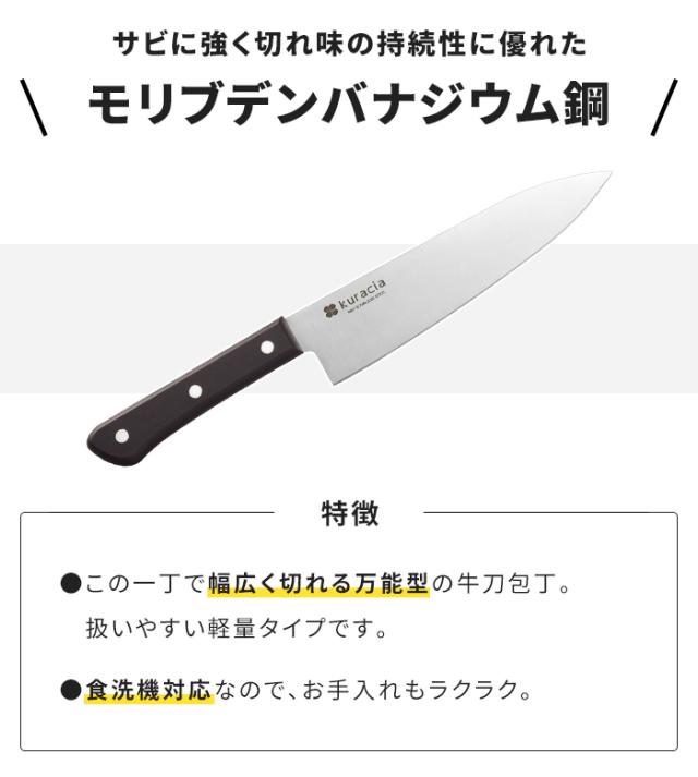 | サビに強く、切れ味の持続性に優れたモリブデンバナジウム鋼の包丁。 持ちやすく扱いやすい軽量タイプ。 食洗器に対応しているので、お手入れもラクラク。 |