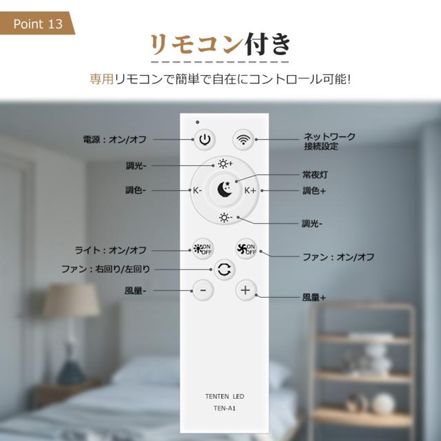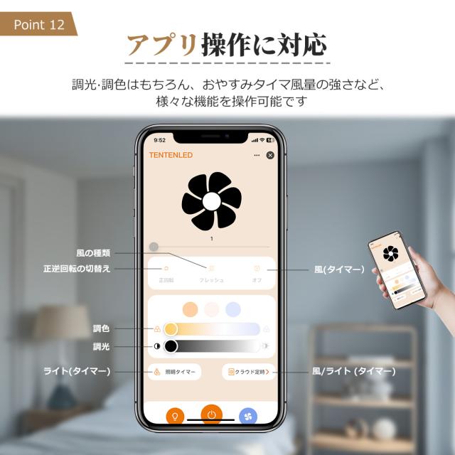 - 本製品は、スマホ操作によりメモリー、タイマー、遠隔制御機能を簡単に実現します。メモリー機能では、好みの設定を保存しておき、いつでも簡単に呼び出せます。タイマー機能を使えば、任意の時間にLEDファンライトをオンやオフに設定できます。さらに、遠隔制御機能により、どこにいてもLEDファンライトを自在に操作できます。