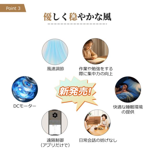 - 本製品にはDCモーターの採用により、静音性能が大幅に向上しています。寝室や書斎など静かな環境が求められる場所でも、心地よく使用することができます。また、夜中に起きたときに明かりを急につける必要がなく、弱い明かりで部屋を照らします。夜中のトイレ移動時などの転倒危険性を減らすことができます。