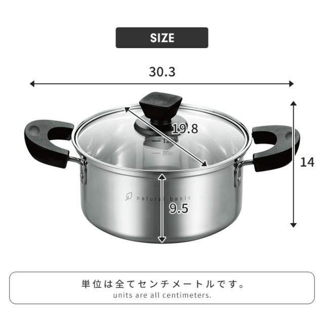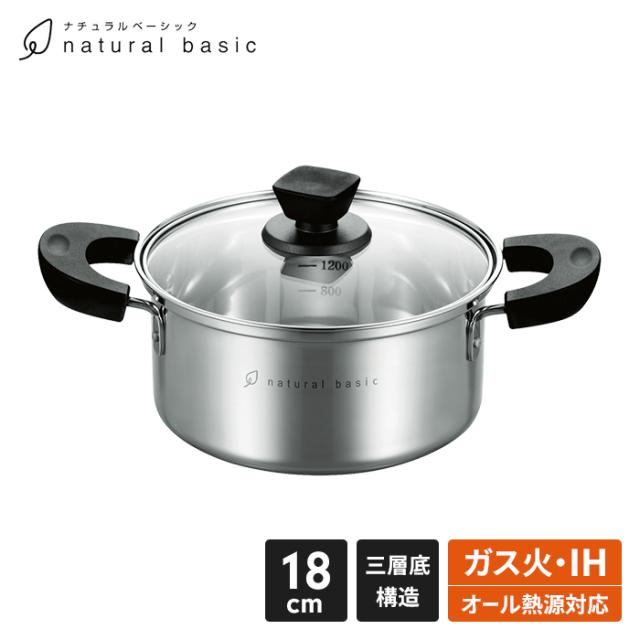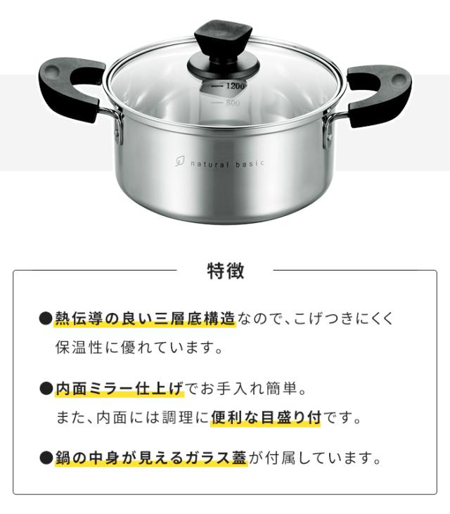 | ナチュラルベーシック|naturalbasic 毎日使いにはシンプルでベーシックなものを。 熱伝導のよい三層底構造なのでこげつきにくく、保温性に優れています。 鍋の中身が見えるガラス蓋。 内面ミラー仕上げでお手入れ簡単。 便利な目盛付き。 様々な料理をおいしく仕上げます。 |