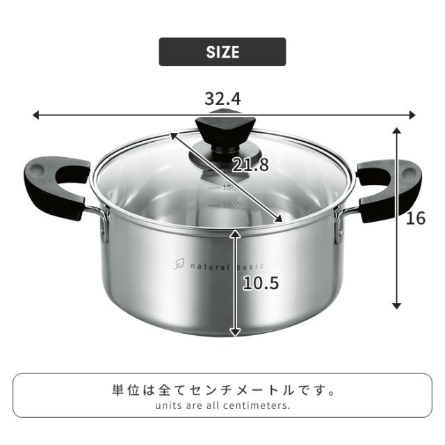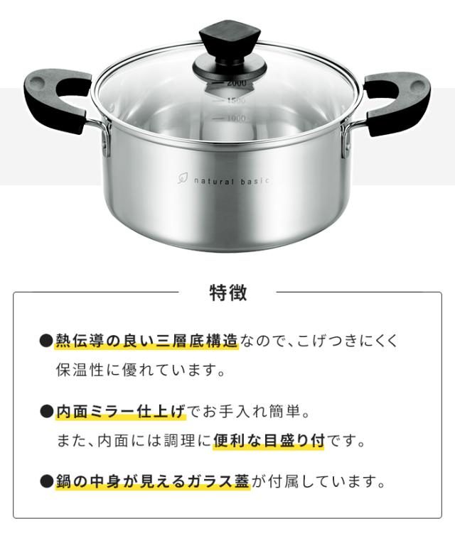 | ナチュラルベーシック|naturalbasic 毎日使いにはシンプルでベーシックなものを。 熱伝導のよい三層底構造なのでこげつきにくく、保温性に優れています。 鍋の中身が見えるガラス蓋。 内面ミラー仕上げでお手入れ簡単。 便利な目盛付き。 様々な料理をおいしく仕上げます。 |