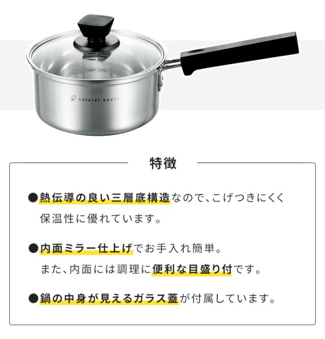 | ナチュラルベーシック|naturalbasic 毎日使いにはシンプルでベーシックなものを。 熱伝導のよい三層底構造なのでこげつきにくく、保温性に優れています。 鍋の中身が見えるガラス蓋。 内面ミラー仕上げでお手入れ簡単。 便利な目盛付き。 様々な料理をおいしく仕上げます。 |