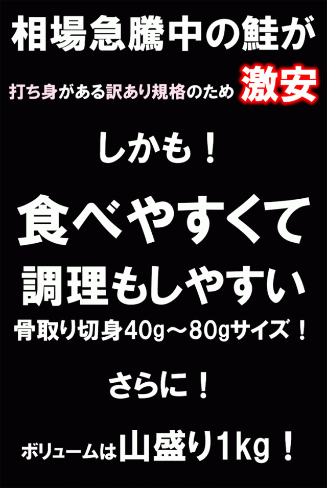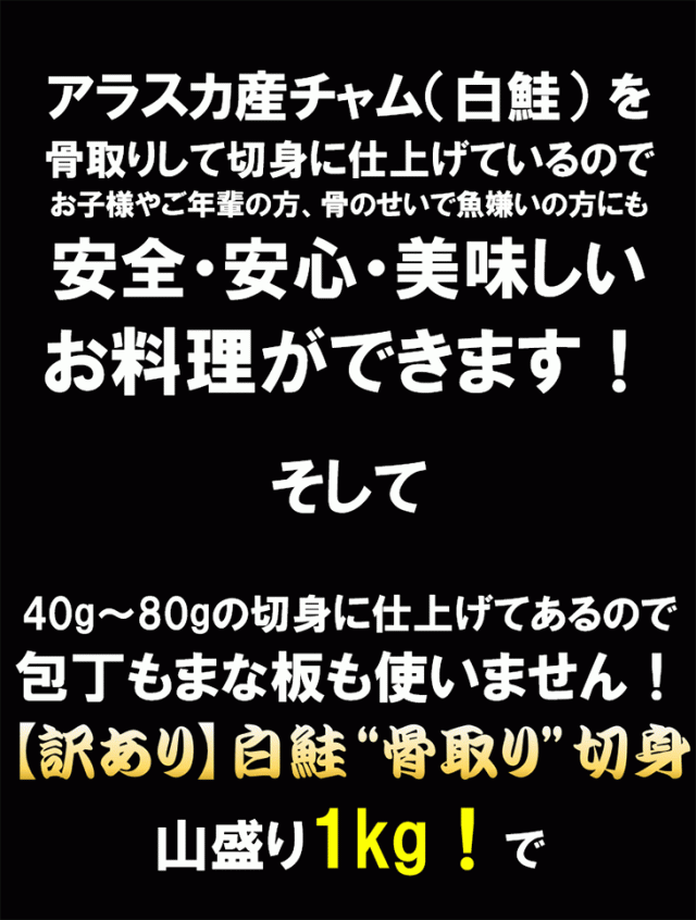 【訳あり】天然白鮭“骨取り”切身 40g-80gサイズが山盛り1kg!訳ありの理由は打ち身 アラスカ湾産チャム ムニエル ソテー ちゃんちゃん焼き サーモンフライ サーモンシチュー
