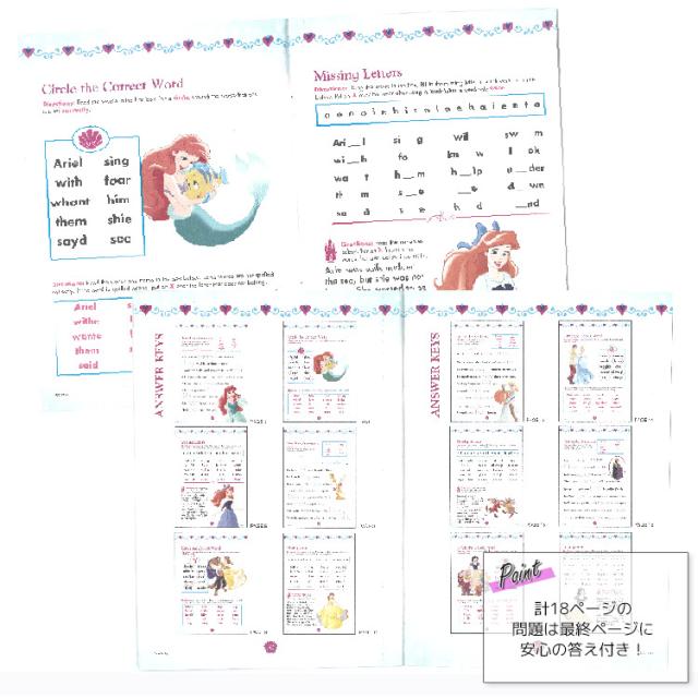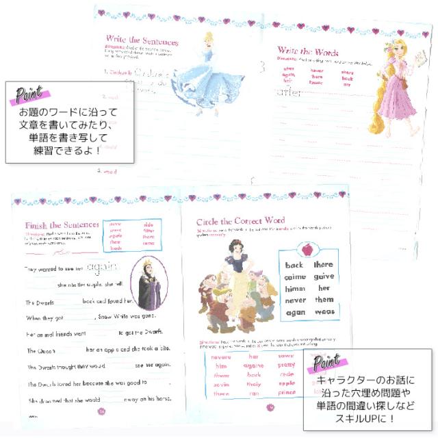 ディズニープリンセスのキャラクターと英語の学習ドリル ページ毎にプリンセスにまつわるお題のワードに添って文章を書いてみたり 単語を書き写して練習! |