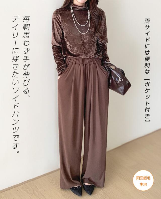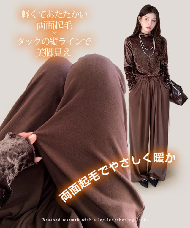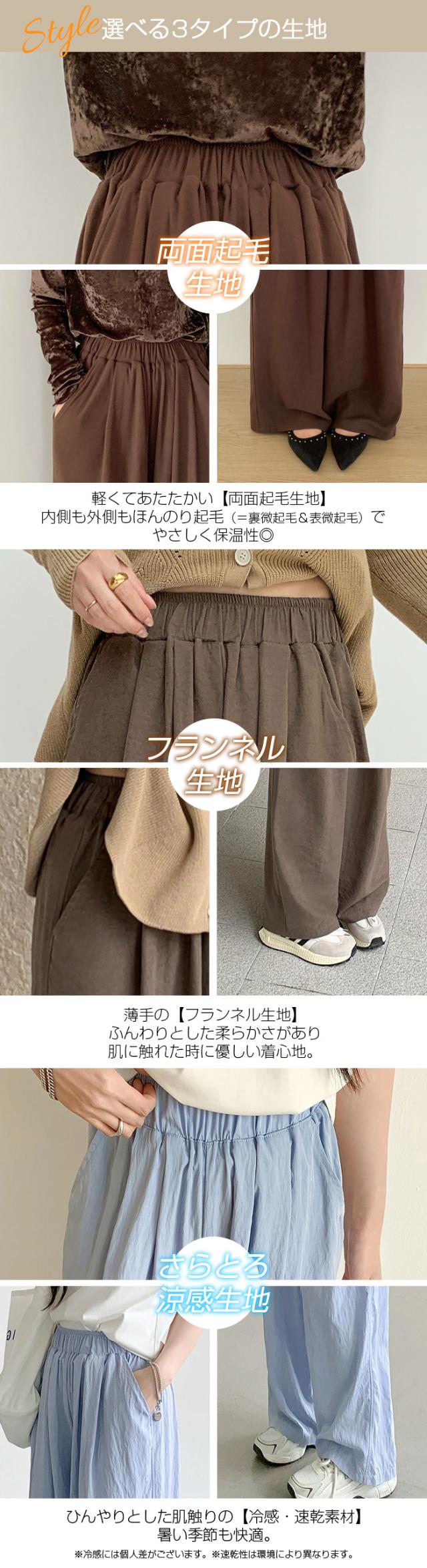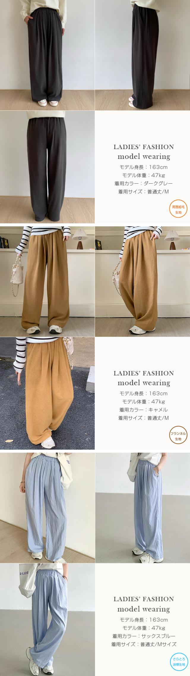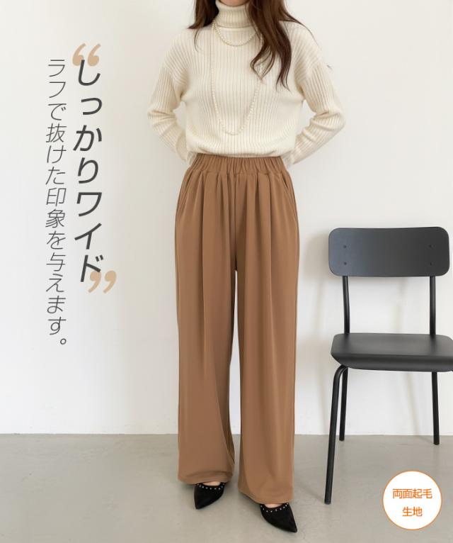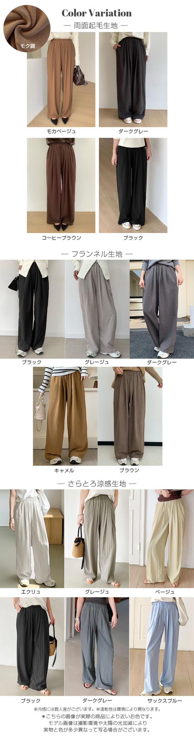 旬の抜け感をつくるダブルタックワイドパンツに、 季節に合わせて選べる3つの素材をご用意。 両面起毛生地:両面ほんのり起毛でやさしく保温。 秋冬のデイリーに。 フランネル生地:ふっくらソフトで上品な表情。 温かみときれいめを両取り。 さらとろ涼感生地:さらり×とろみの落ち感。 汗ばむ時期や室内でも快適。 前ウエストに入れたタックが縦ラインを強調し、 脚のラインを拾いにくい立体感のあるシルエットで体型カバーも叶います。 ウエスト総ゴム&両サイドポケットで使い勝手抜群。 通勤からお出かけ、 旅先まで幅広く活躍するアイテムです。 《商品ポイント》 [両面起毛生地] 両面起毛のぬくもり×タックの美ライン。 肌側も表側もあたたかい、やわらかなタッチ。 [フランネル生地] 起毛感のあるフランネル素材で季節感のある風合い 秋冬のデイリー使いにぴったりな定番アイテム [さらとろ涼感生地] ひんやりとした肌触りで暑い季節も快適。 通気性が良く軽量なので、真夏でもベタつかず、 さらっとした穿き心地 ※冷感には個人差がございます。 ※速乾性は環境により異なります。 [全タイプ共通] タック入りで立体感のあるキレイシルエット ウエストゴム仕様でストレスフリーな穿き心地 カジュアルからきれいめまで幅広いスタイルに対応 《コーディネート提案》 [両面起毛生地] きれいめ通勤:タートルニット+ローファー+ミニショルダー。 カジュアル:裏毛スウェット+スニーカー+キャップで抜け感。 ショート丈合わせ:ショートカーデ+ボリュームマフラーでバランスUP。 大人モード:Vネックニット+ショート丈ダウン+サイドゴアブーツ。 在宅ワーク:ハイゲージニット+フラットで快適&きちんと。 [フランネル生地] シンプルなニットと合わせて大人のリラックススタイルに ジャケットを羽織ればオフィスでも使えるきちんと感コーデ スニーカーを合わせてカジュアルダウンすれば週末のお出かけにも◎ ロングコートと合わせてIラインを意識したスタイルアップコーデに [さらとろ涼感生地] 白Tシャツ×サンダル と合わせれば、夏らしい軽やかな休日スタイルに シンプルなシャツやカーディガンを羽織れば、きれいめな通勤コーデに ボーダートップスやキャップを合わせて、爽やかなデイリーカジュアルに 《サイズ・カラーバリエーション》 サイズ:普通丈 / 短め丈 M / L カラー: 裏微起毛生地…ブラック/ブラウン/ダークグレー/キャメル フランネル生地…ブラック / グレージュ / ダークグレー / キャメル / ブラウン さらとろ涼感生地…ブラック / グレージュ / ベージュ / ダークグレー / エクリュ / サックスブルー 《素材・機能性》 ・素材:両面起毛生地…ポリエステル90%、ポリウレタン10% フランネル生地… さらとろ涼感生地…ポリエステル95%、ポリウレタン5% ・透け感:淡い色はヌーディーカラーのインナー着用を推奨 ・伸縮性:両面起毛生地…あり フランネル生地/さらとろ涼感生地…なし ・厚み:両面起毛生地/フランネル生地…普通 さらとろ涼感生地…薄手 |