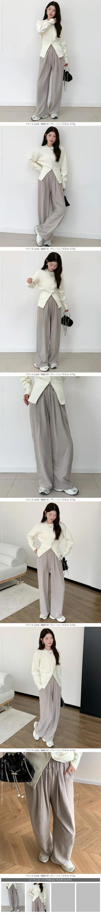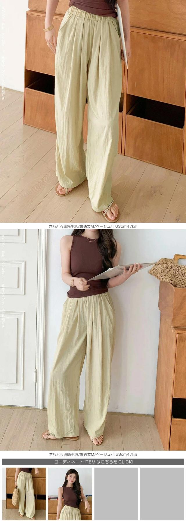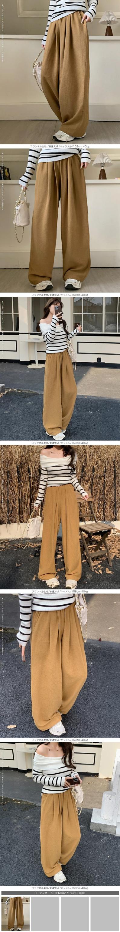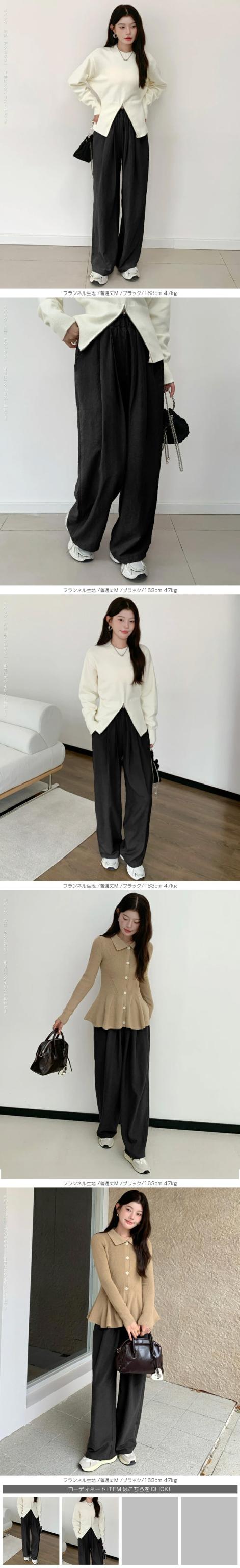 旬の抜け感をつくるダブルタックワイドパンツに、 季節に合わせて選べる3つの素材をご用意。 両面起毛生地:両面ほんのり起毛でやさしく保温。 秋冬のデイリーに。 フランネル生地:ふっくらソフトで上品な表情。 温かみときれいめを両取り。 さらとろ涼感生地:さらり×とろみの落ち感。 汗ばむ時期や室内でも快適。 前ウエストに入れたタックが縦ラインを強調し、 脚のラインを拾いにくい立体感のあるシルエットで体型カバーも叶います。 ウエスト総ゴム&両サイドポケットで使い勝手抜群。 通勤からお出かけ、 旅先まで幅広く活躍するアイテムです。 《商品ポイント》 [両面起毛生地] 両面起毛のぬくもり×タックの美ライン。 肌側も表側もあたたかい、やわらかなタッチ。 [フランネル生地] 起毛感のあるフランネル素材で季節感のある風合い 秋冬のデイリー使いにぴったりな定番アイテム [さらとろ涼感生地] ひんやりとした肌触りで暑い季節も快適。 通気性が良く軽量なので、真夏でもベタつかず、 さらっとした穿き心地 ※冷感には個人差がございます。 ※速乾性は環境により異なります。 [全タイプ共通] タック入りで立体感のあるキレイシルエット ウエストゴム仕様でストレスフリーな穿き心地 カジュアルからきれいめまで幅広いスタイルに対応 《コーディネート提案》 [両面起毛生地] きれいめ通勤:タートルニット+ローファー+ミニショルダー。 カジュアル:裏毛スウェット+スニーカー+キャップで抜け感。 ショート丈合わせ:ショートカーデ+ボリュームマフラーでバランスUP。 大人モード:Vネックニット+ショート丈ダウン+サイドゴアブーツ。 在宅ワーク:ハイゲージニット+フラットで快適&きちんと。 [フランネル生地] シンプルなニットと合わせて大人のリラックススタイルに ジャケットを羽織ればオフィスでも使えるきちんと感コーデ スニーカーを合わせてカジュアルダウンすれば週末のお出かけにも◎ ロングコートと合わせてIラインを意識したスタイルアップコーデに [さらとろ涼感生地] 白Tシャツ×サンダル と合わせれば、夏らしい軽やかな休日スタイルに シンプルなシャツやカーディガンを羽織れば、きれいめな通勤コーデに ボーダートップスやキャップを合わせて、爽やかなデイリーカジュアルに 《サイズ・カラーバリエーション》 サイズ:普通丈 / 短め丈 M / L カラー: 裏微起毛生地…ブラック/ブラウン/ダークグレー/キャメル フランネル生地…ブラック / グレージュ / ダークグレー / キャメル / ブラウン さらとろ涼感生地…ブラック / グレージュ / ベージュ / ダークグレー / エクリュ / サックスブルー 《素材・機能性》 ・素材:両面起毛生地…ポリエステル90%、ポリウレタン10% フランネル生地… さらとろ涼感生地…ポリエステル95%、ポリウレタン5% ・透け感:淡い色はヌーディーカラーのインナー着用を推奨 ・伸縮性:両面起毛生地…あり フランネル生地/さらとろ涼感生地…なし ・厚み:両面起毛生地/フランネル生地…普通 さらとろ涼感生地…薄手 |