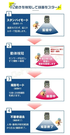 【人感センサー&暗視機能】:高感度な人体・動体センサー(PIRセンサー)を搭載しており、最大90°の広範囲の人や動物の動きを検知して自動的撮影+録画を行います。 夜間や明るさが悪いときでさえ、明るい光を出さず、鮮明な写真を撮ることができます。