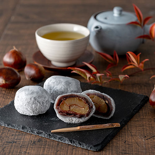 柔らかな羽二重餅にこし餡と渋皮栗をまるごと包み込みました。