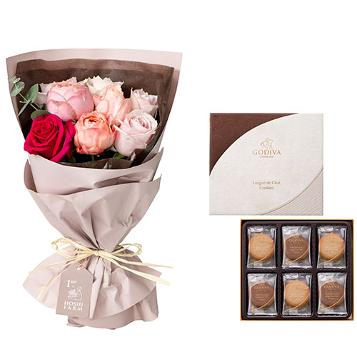 ホシファームのバラのブーケとゴディバのチョコレートサンドクッキーのセットです。
