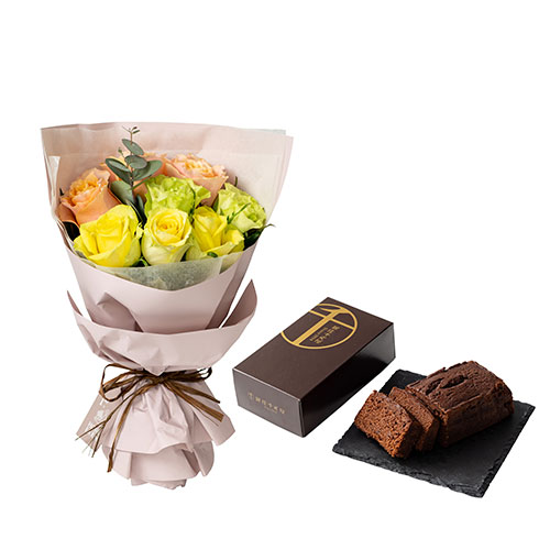 ホシファームのバラのブーケと銀座千疋屋のチョコパウンドケーキのセットです。