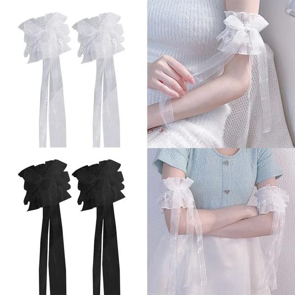 蝶ネクタイ付きフリルレースアームウォーマー、フローラルレイヤーカフ、伸縮性のあるオーバースリーブ、ブライダルアームカバー