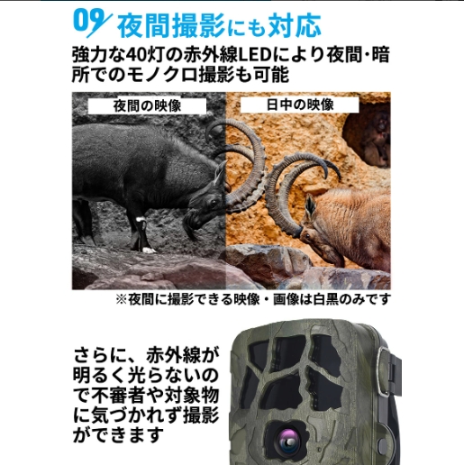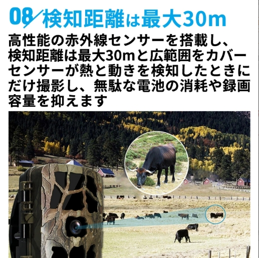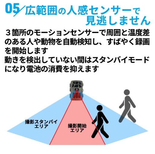 センサーが熱と動きを検知したときだけ撮影し、無駄な電池の消費や録画容量を抑えます