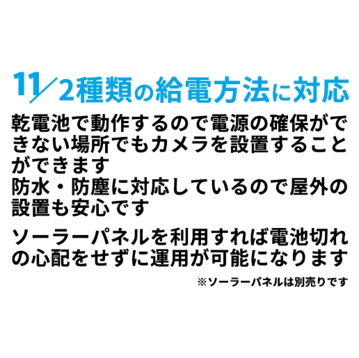 乾電池で動作するので電源の確保ができない場所えもカメラを設置することができます。