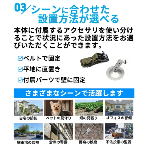 また、自宅の防犯、ペットの見守り、畑の見張り、オフィスの警備、駐車場の監視、倉庫の警備、野鳥の観察、不法投棄の監視などさまざまなシーンで活躍します。