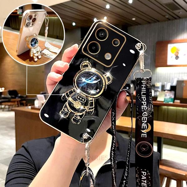 Xiaomi Redmi,宇宙飛行士ホルダー,シリコンスタンドカバー,Note 13 pro plus,13 pro,4g,5g,13 c用のクロスボディストラップ付きメッキケース