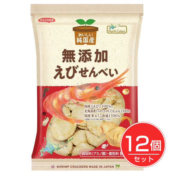「ノースカラーズ 純国産 えびせんべい 65g×12個セット」は、国産のエビを贅沢に使用したせんべいです。エビ以外の材料のジャガイモ、こめ油も国産のみを使用しています。