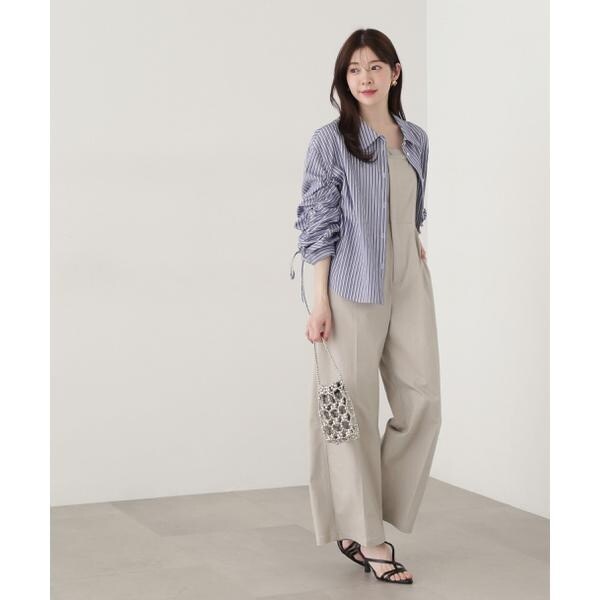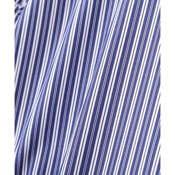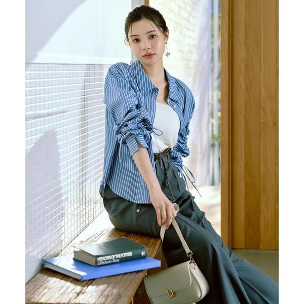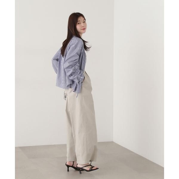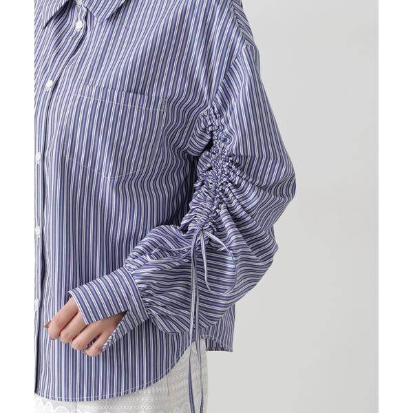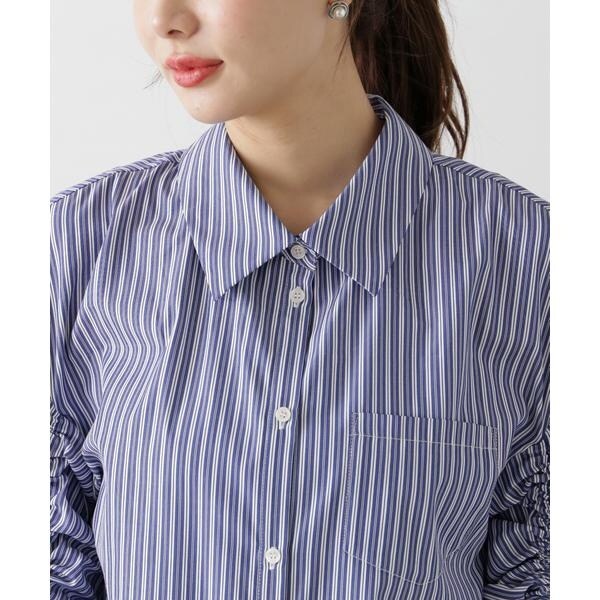 袖のシャーリングリボンがポイントのシャツ。袖のシャーリングリボンで、袖丈の長さ調節可能です。ルーズ感のあるシルエットは、前ボタンを開けてラフに羽織っても着こなせます。無地ホワイト、ブルーストライプ柄の2色展開です。<素材>綿混のシャツとストライプ生地を使用しています。<詳細>仕様・前ボタン裏地・なし透け感・なし / 光沢・なし / 伸縮性・なし 生地の厚さ・普通※モデルの着用画像の場合、光の当たり具合により、実際の色味と異なって見えることがございます。色味は、商品単体の画像をご参照ください。