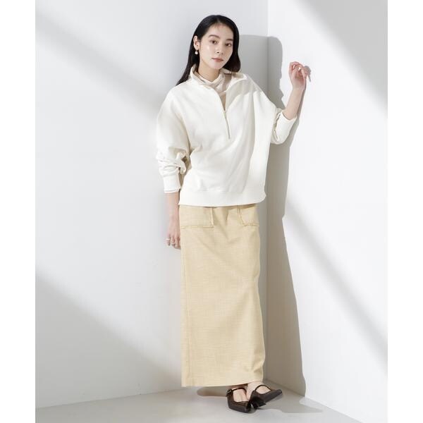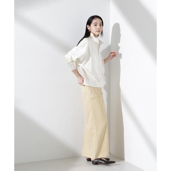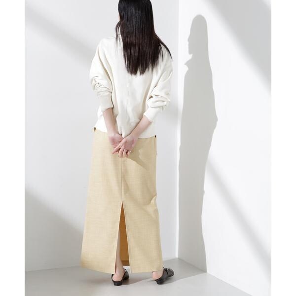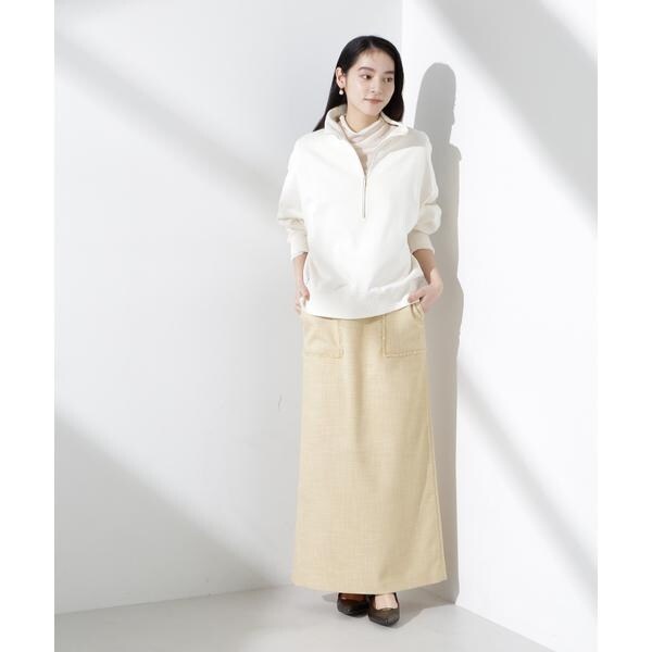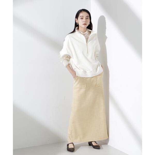 トレンドのツイード素材で仕上げたIラインスカート。アウトパッチポケットにフリンジディテールを施しカジュアルさを出したアイテム。ウエスト後ろ部分のみゴム仕様でノンストレスに着用でき、トップスインもすっきり見せてくれる一枚です。