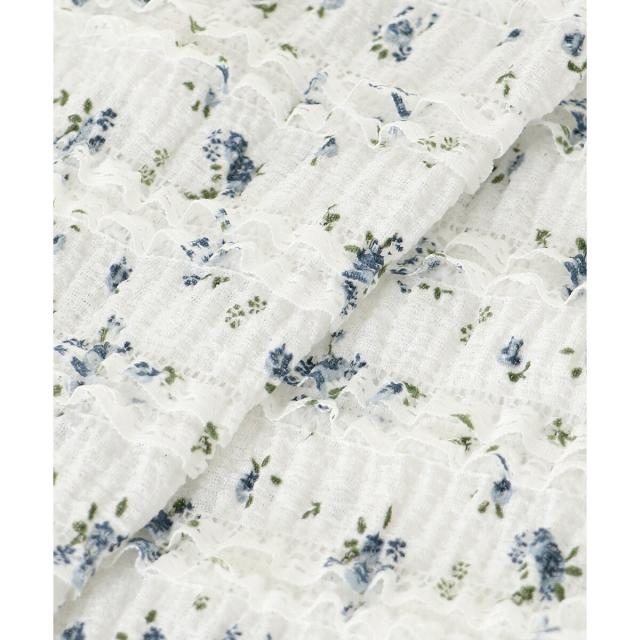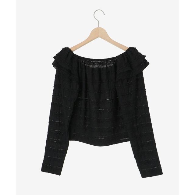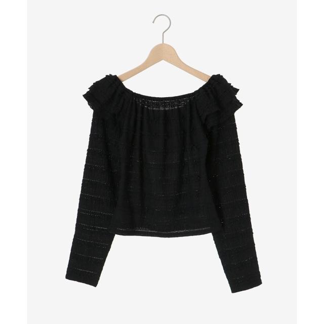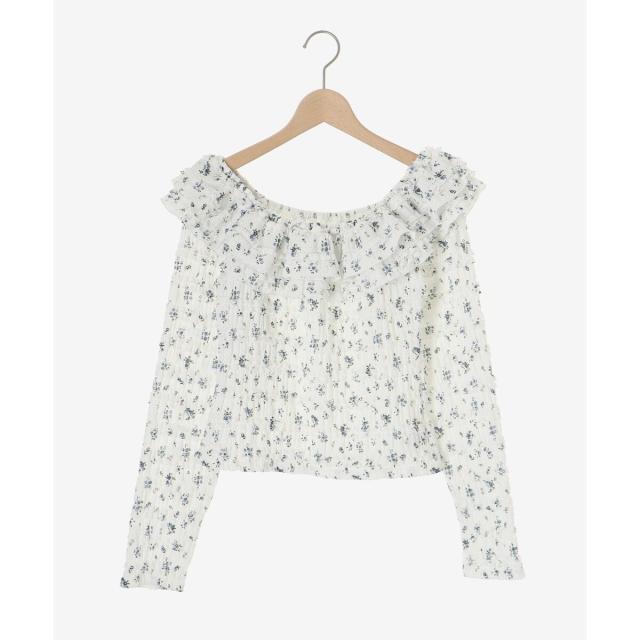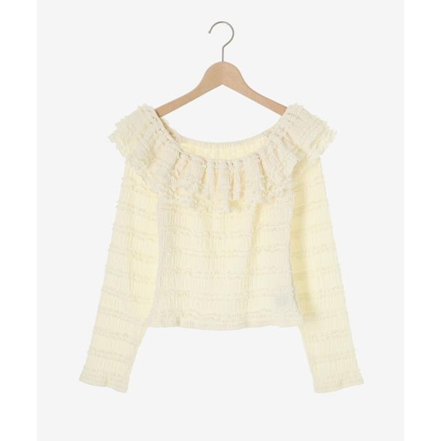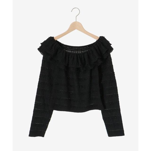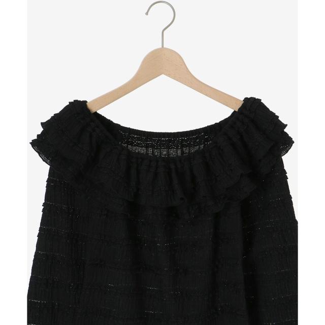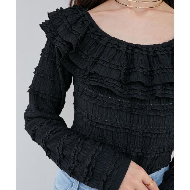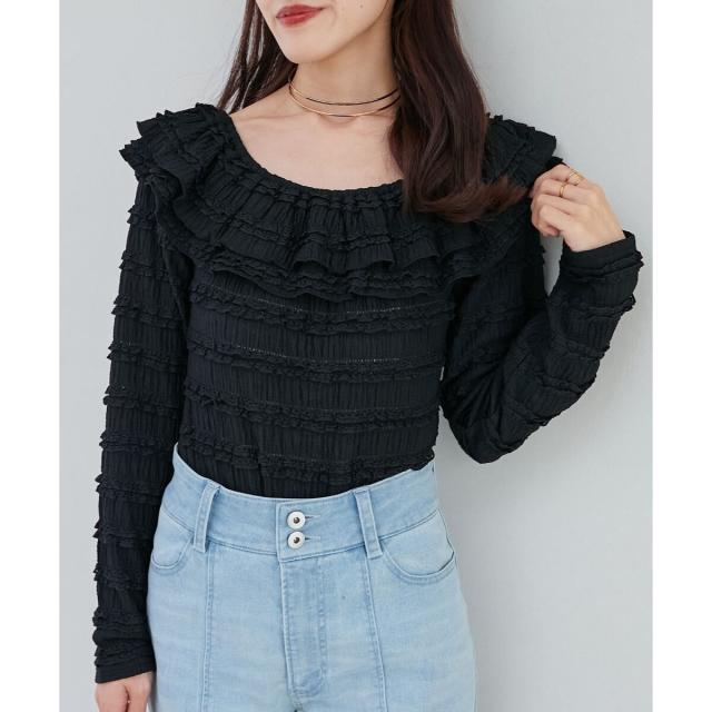 たっぷりのフリルがフェミニンな印象を引き立て、広めに開いた首周りが顔周りをすっきりと見せてくれます。