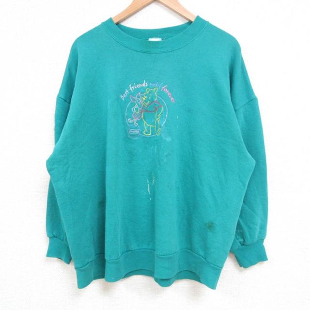 古着 長袖 スウェット メンズ 00年代 00s ディズニー DISNEY くまのプーさん 刺繍 クルーネック 青緑 XLサイズ 中古 スエット 中古 古着