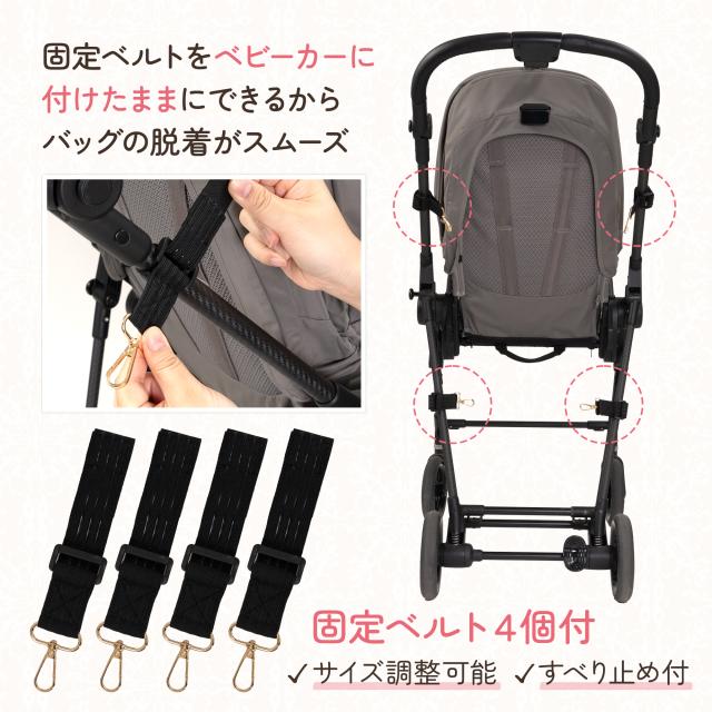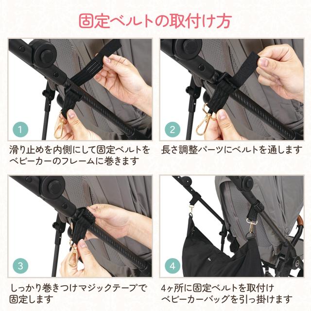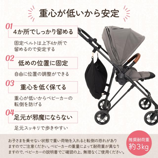 ベビーカーの低い位置に装着できるので、重心を低く保てて転倒を防ぐことができます。固定ベルトの位置は自由に調整できますので、車輪より10cm上の位置にくるように調整してください。<推奨耐荷重約3kg>お子さまを乗せない状態で重い荷物を入れると転倒の恐れがありますのでご注意ください。ベビーカーの重量によって耐荷重が異なりますので、ベビーカーの説明書でご確認の上、無理なくご使用ください。
