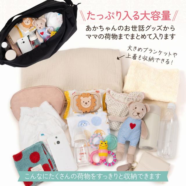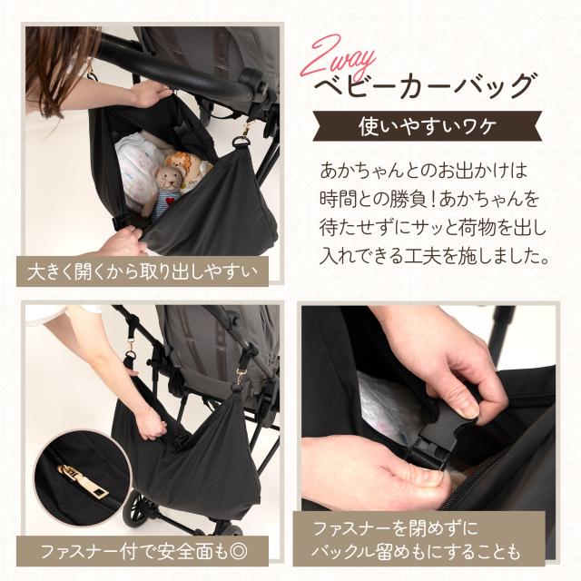 ベビーカーバッグを使いたいけど取外しが面倒、取外してバッグにした時にダサいなどのご不満をお持ちの方にお使いいただきたい2WAYベビーカーバッグ&トートバッグ。ベビーカーに付けたままにできる固定ベルトに、ベビーカーバッグを引っ掛けるだけなので脱着がとても簡単。トートバッグにした時もシンプルなデザインで恥ずかしくありません。大容量仕様なので、おむつ、おしりふき、お着替え、タオル、おもちゃ、哺乳瓶、おやつなど赤ちゃんのお出かけグッズから、ママの荷物までまとめてスッキリ収納できます。荷物が多くてもスマートにおしゃれに行動したいママの強い味方です。