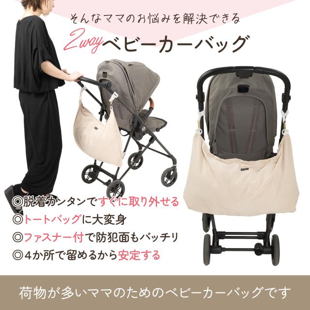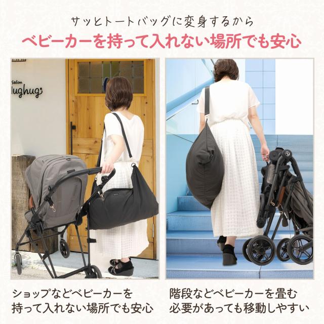 ベビーカーバッグから、あっという間にトートバッグに切り替えできる2WAYタイプのベビーカーバッグ。ベビーカーを持って入れない場所でも、ベビーカーバッグをサッと取外せばトートバッグに大変身。荷物が多くてもスマートに行動したいママの味方です。
