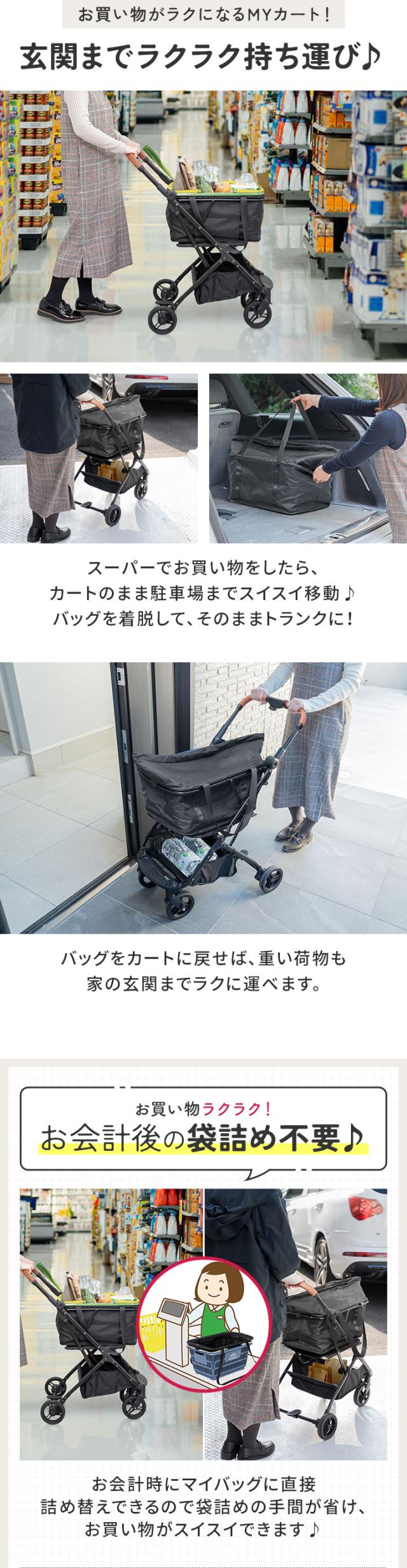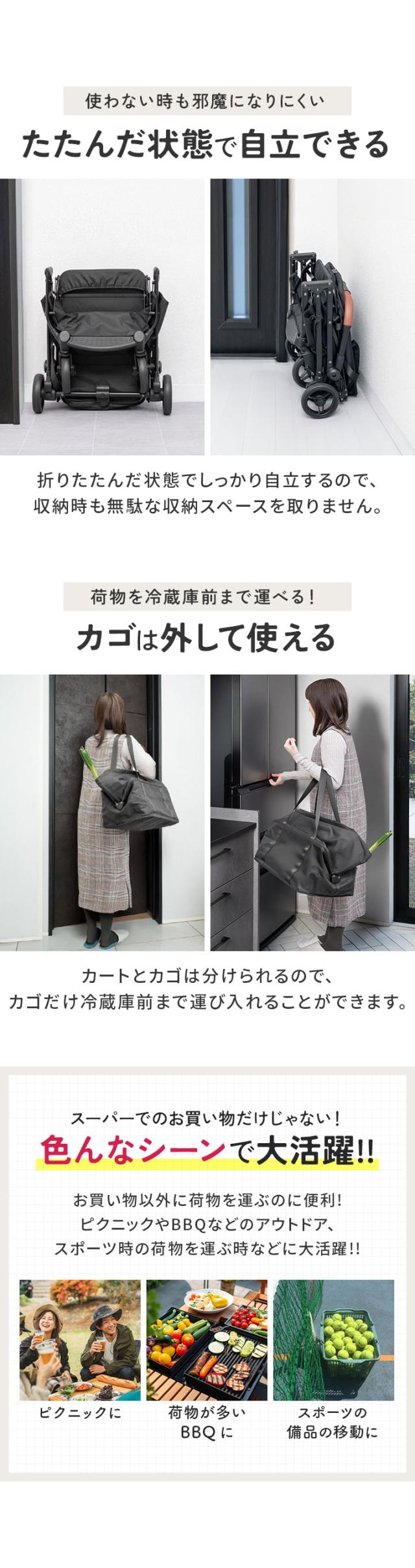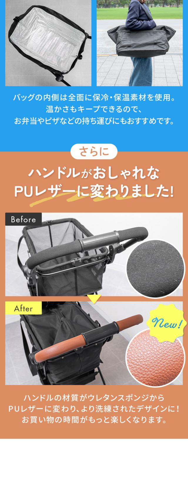 | 材質: 本体 : アルミ、PU カゴ:スチール、ポリエステル(内布:アルミニウム加工)、PP タイヤ:EVA |