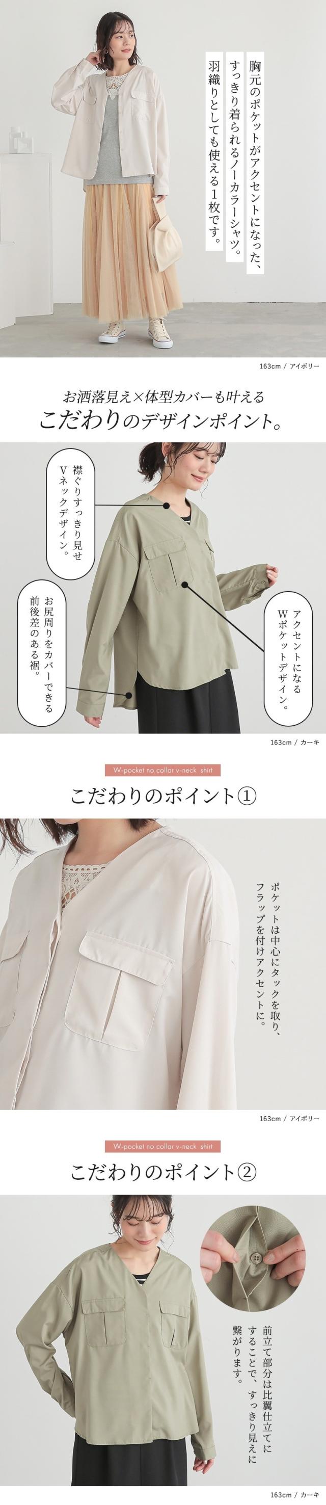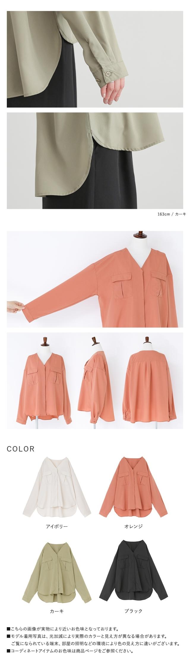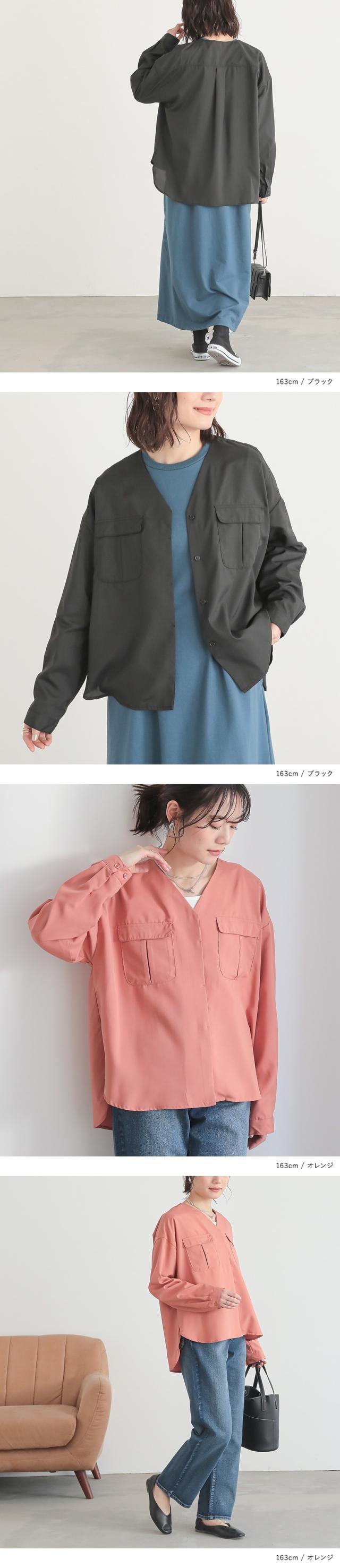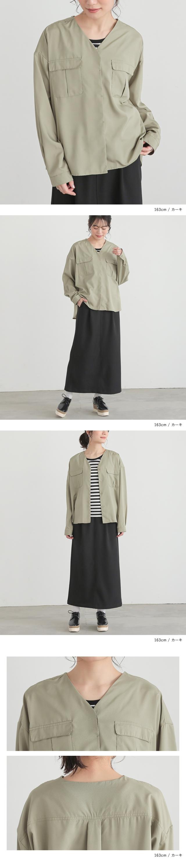『VネックWポケットシャツ』※メール便可※【10】[シャツ レディース トップス 長袖 ブラウス Vネック ノーカラー ポケット 羽織 レイヤード 重ね着 落ち感 お尻が隠れる 春 夏 秋]