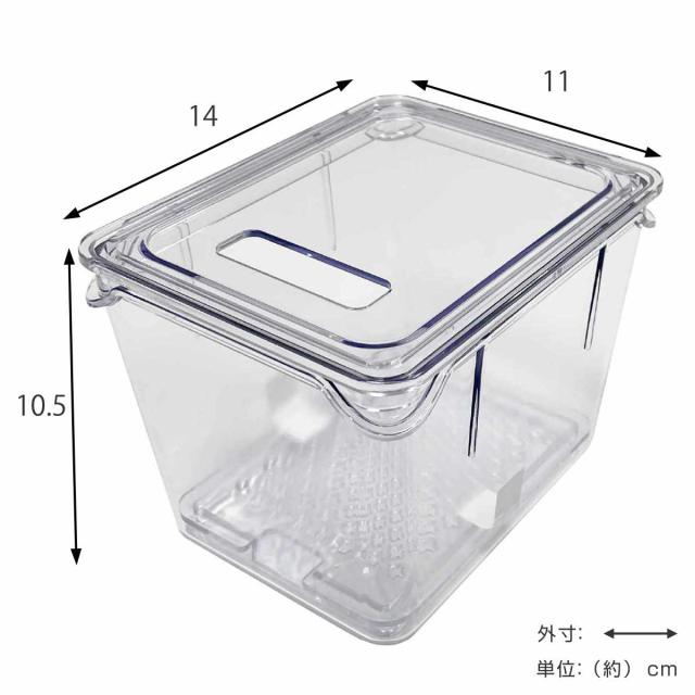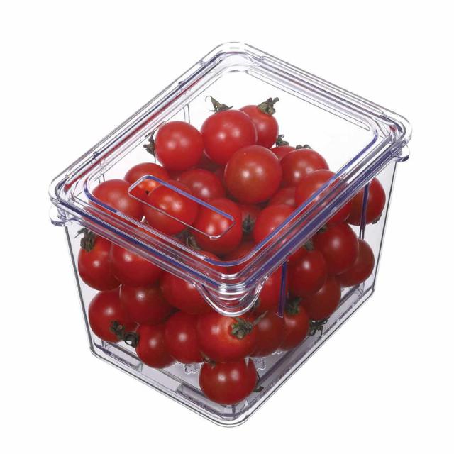 洗ったままの野菜を入れても水切りできる、すのこ付きです。容器上部の四隅には持ちやすく、フタを開けやすいつまみが付いています。