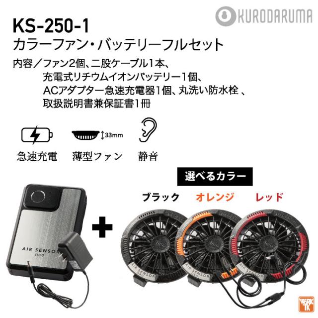 2025年新作 クロダルマ KS-250-1 カラーファンバッテリーフルセット 最大20V 空調作業服 空調ウェア 電動ファン ファン付きウェア 暑さ対策 涼しい 急速充電 静音 薄型ファン バッテリー エアーセンサー kd-fanbt3