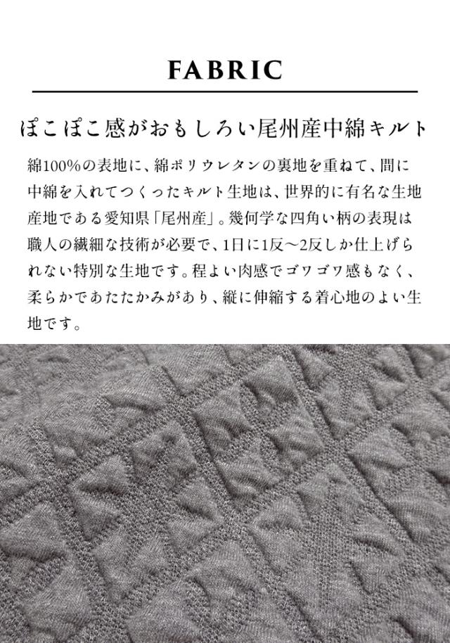 【裾】全体の割合:綿57%・ポリエステル42%・ポリウレタン1%(表地:綿100%、裏地:綿ポリウレタン、中綿:ポリエステル100%、接結糸:ポリウレタン100%)