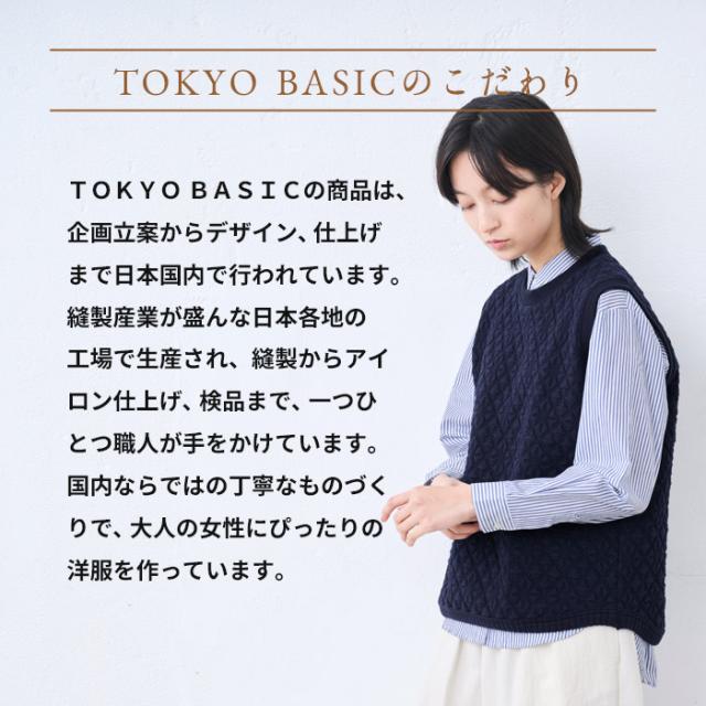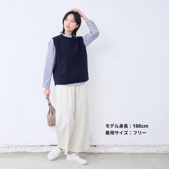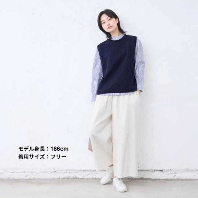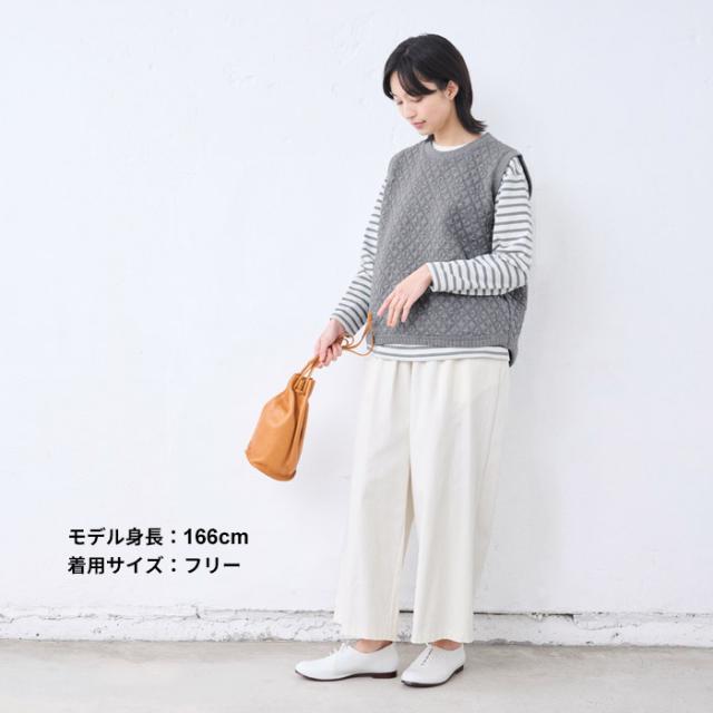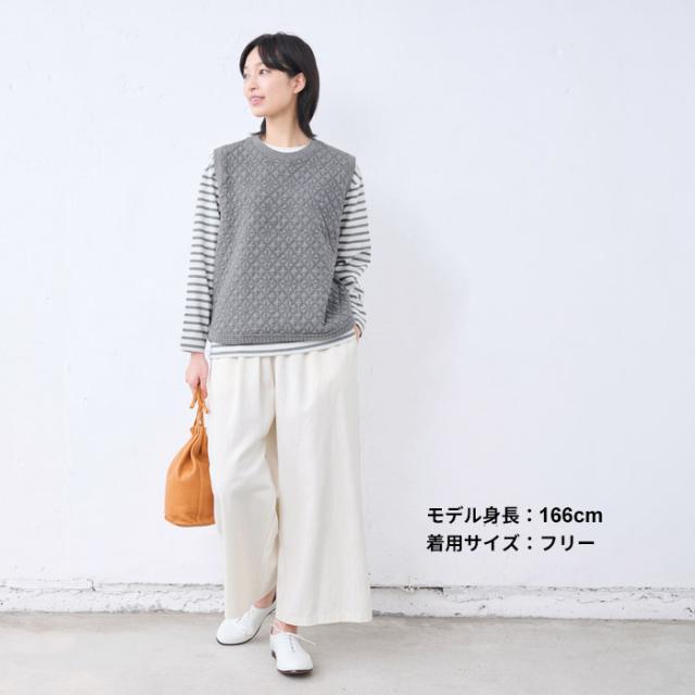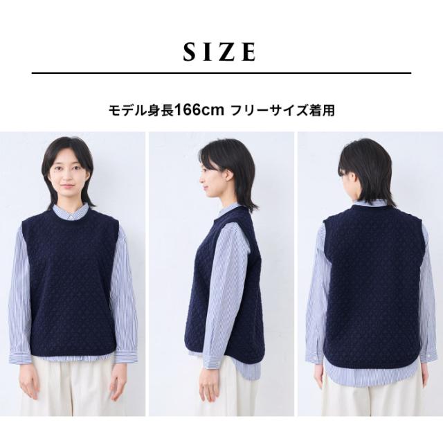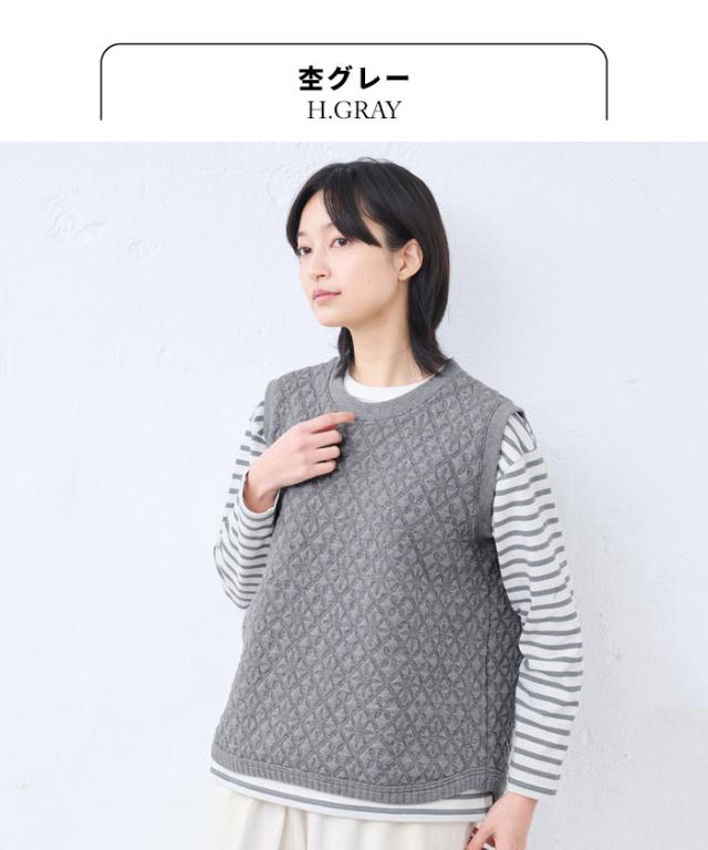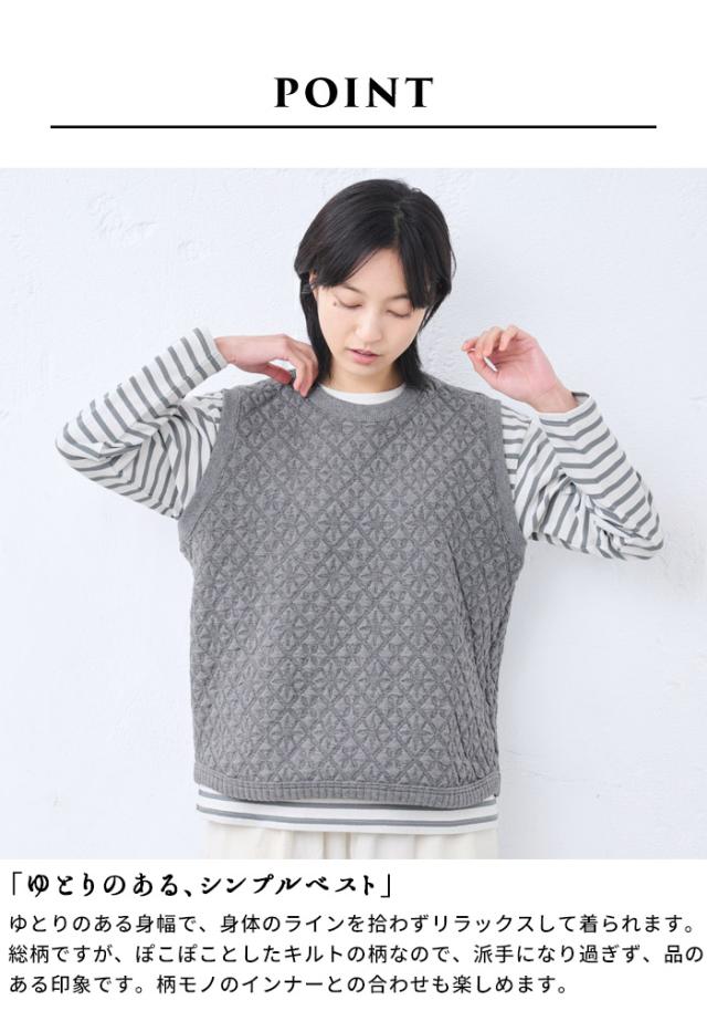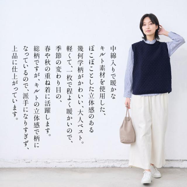 特徴 中綿入りで暖かなキルト素材を使用した、ぽこぽことした立体感のある幾何学柄がかわいい、大人ベスト。軽くて、一枚で程よく暖かいので、季節の変わり目の、春や秋の重ね着に活躍します。総柄ですが、キルトの立体感で柄になっているので、派手になりすぎず、上品に仕上がっています。