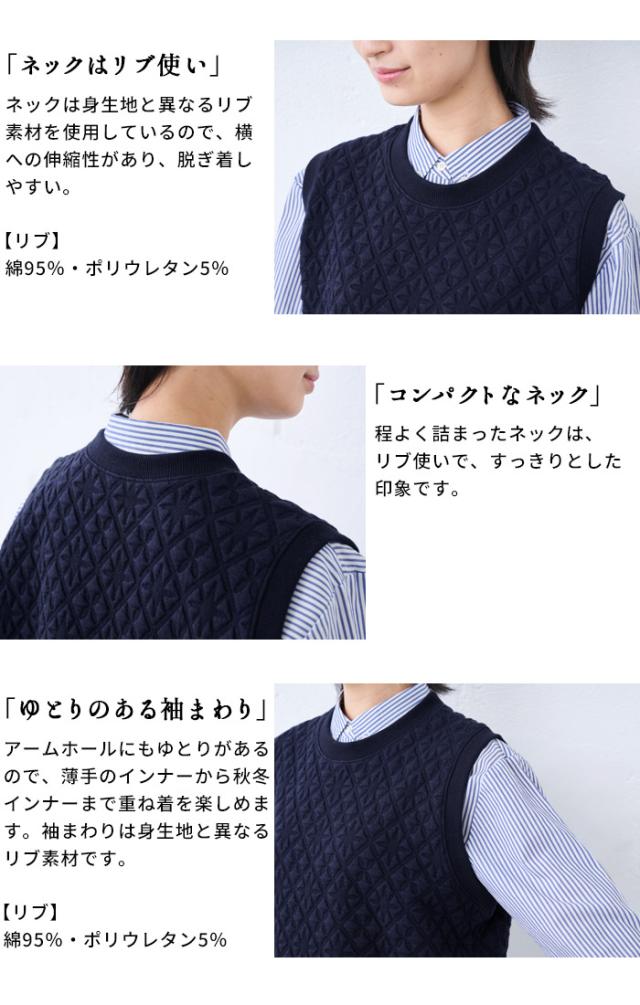 レディース 春 綿 コットン 尾州産 ストレッチ キルト 幾何学柄 リブ使い ベスト 日本製 40代 50代 60代 女性 キルティング 中綿 トップス 秋 冬 ゆったり 体型カバー カジュアル 重ね着 シンプル おしゃれ 暖かい きれいめ 春服 中綿ベスト 大人 可愛い かわいい ナチュラル 丸首 ノースリーブ プルオーバー 厚手 秋冬 グレー ネイビー 紺